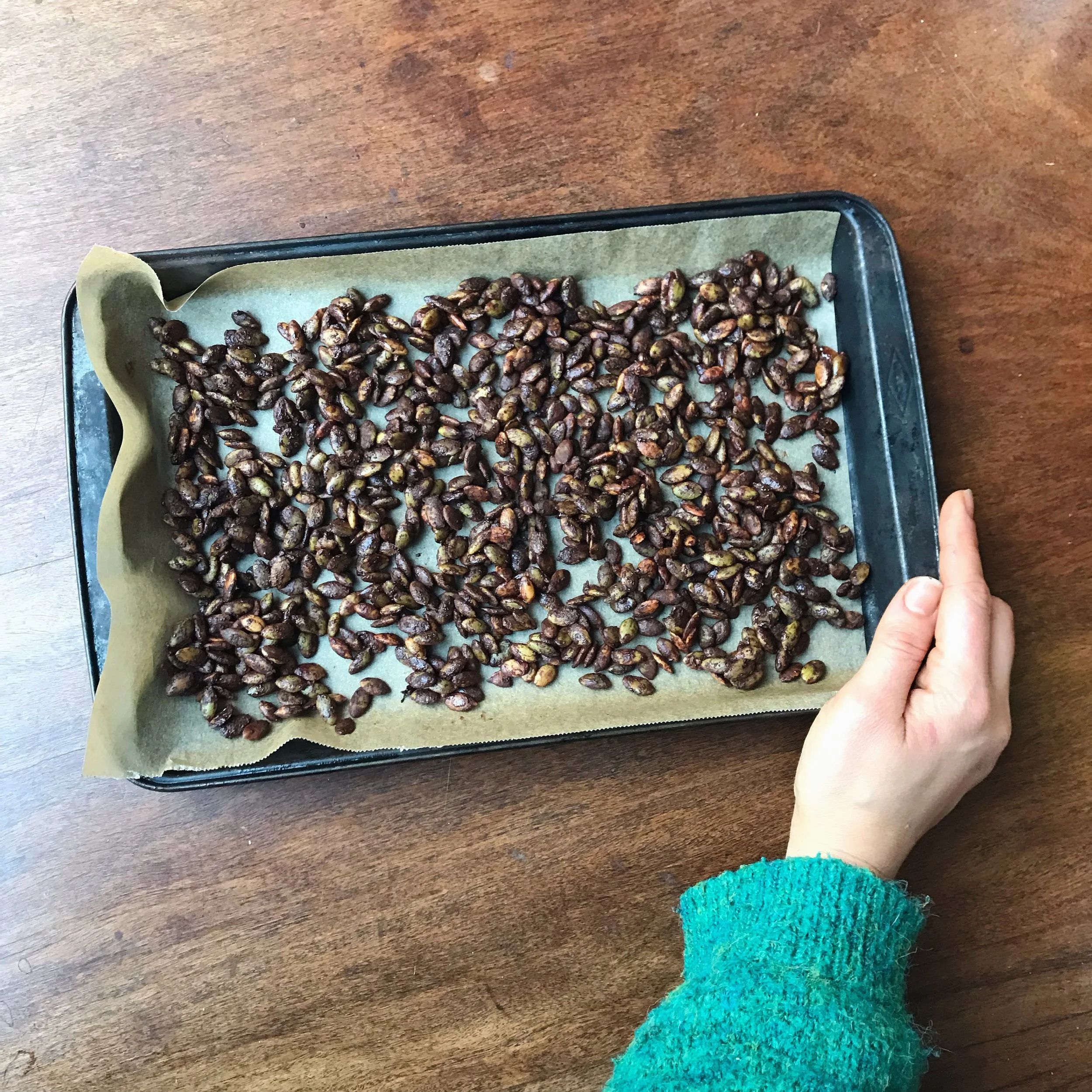 3. Spread onto a lined baking tray, making sure the pumpkin seeds are in a single layer. Sprinkle over a touch more salt and cinnamon